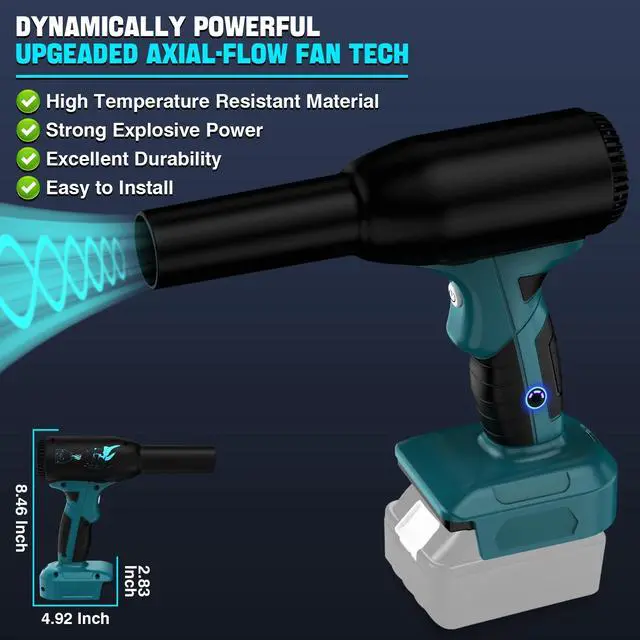 high quality Material: ABS, PP --Air dusters, This compressed air dusters the maximum speed of 90000 RPM, Compressed air can delivering strong performance, Strong wind, even the face can be blown deformation, Newly upgraded version, easy to clean every corner. ^^ Compatible with Makita 18V BatteryElectric Jet Dry Blower is suitable for Makita 18V Lithium-Ion Batteries BL1820B BL1830B BL1840B BL1850B BL1860B etc. air duster fits in your power tool battery, easy to carry and used indoors and outdoors. Mini blower Light weight and more comfortable user experience. ^^ New Pulley Mode Functional DesignCompressed air duster, This air dusters is new upgraded version, we not only have, 3-gear mode, but also add a new pulley mode, smooth sliding, more convenient and sensitive to use, you can choose the wind power you need. AsloJet Fan adopting ergonomic design, the handle is more comfortable to touch. ^^ Multi-function, multi-scene Computer dustercompressed air dusters is Used for keyboard cleaning kit, pc duster, car detailing supplies, air broom, electric leaf blower, snow blower, turbo fan and so on.