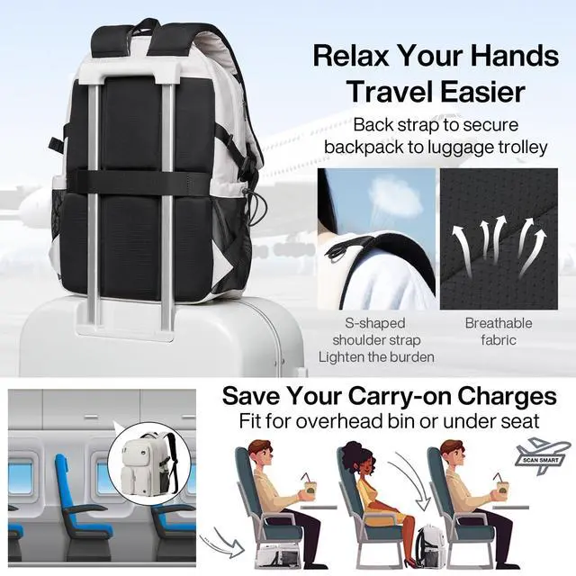 The top handle is perfect for when you want to carry your bag and give your shoulders a break. ^^ OVERALL DIMENSION The backpack external dimensions is 11.02 x 6.69 x 16.93 inch. A luggage strap in the back which can trap the suitcase telescopic handle, so that you can free your shoulders and hands when travel.