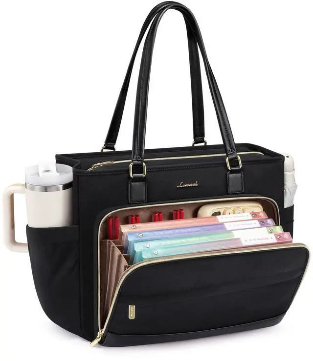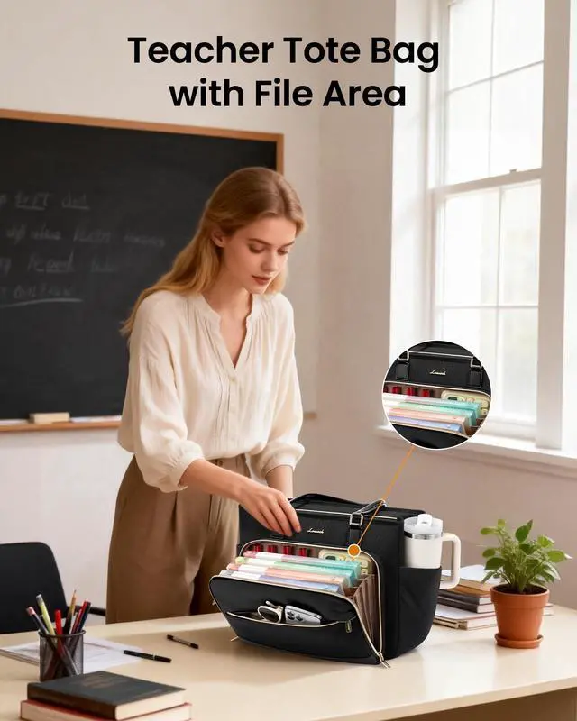Accordion File Organizer & Multiple Pockets DesignThis LOVEVOOK teacher tote bag features 18 extra pockets for total organization. The front accordion file organizer neatly stores A4 papers, documents, and foldersperfect for lesson plans, handouts, or meeting notes. You also get dedicated pen slots, a full sleeve for notepads or a calculator, plus a secure zippered compartment for your phone, keys, and small essentials. With everything in its place, you can find what you need in seconds. ^^ Big Cup Holder with Adjustable BuckleOur oversized, external cup holder is designed for large tumblers and water bottles.
