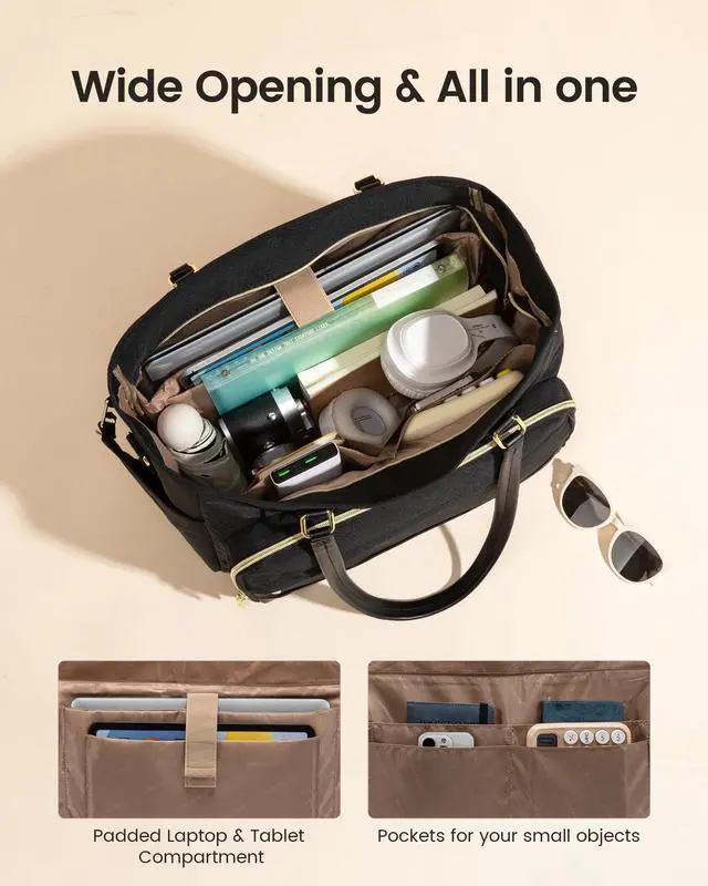 The adjustable buckle secures everything from a slim coffee cup to a giant 30-oz bottle snugly in place. Having it on the outside means quick, easy access without ever opening the main bag, keeping all potential drips and condensation safely away from your important documents and electronics insidea thoughtful upgrade for any teacher bag or work bag. ^^ Double Padded CompartmentsInside the main compartment, The laptop bag for womenan ideal tote bag with laptop compartmentis equipped with two padded sleevesone fits a laptop up to 17.3 inch securely, and the other is perfect for a tablet.
