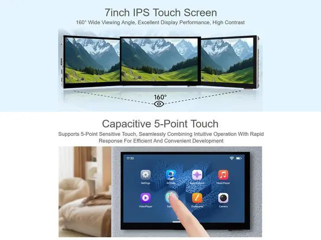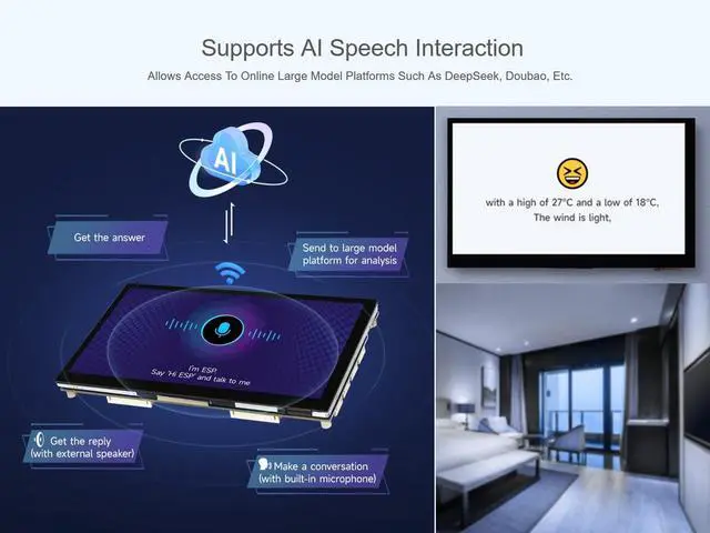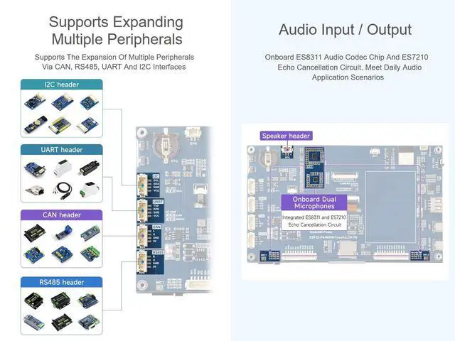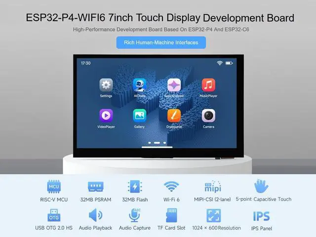 ESP32-P4-WIFI6-Touch-LCD-7B development board based on ESP32-P4 and ESP32-C6, high-performance MCU with RISC-V 32-bit dual-core and single-core processors, supports 2.4GH z Wi-Fi 6 and Bluetooth 5 / BLE 5, supports AI speech interaction ^^ ESP32-P4-WIFI6 7inch touch LCD dev board, equipped with 7inch touch display 1024 600 resolution 16.7M Color, features rich human-machine interfaces including MIPI-CSI, MIPI-DSI, USB 2.0 OTG HS, SDIO 3.0 TF card slot, dual microphones, speaker header, etc. ^^ 32MB PSRAM in the chip's package, with onboard 32MB Nor Flash. 128 KB HP ROM, 16 KB LP ROM, 768 KB HP L2MEM, 32 KB LP Static RAM, 8 KB TCM ^^ Powerful image and voice processing capability.