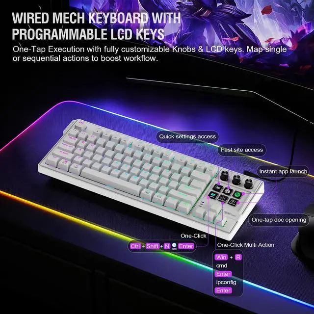 AI VISUAL MACRO & CUSTOM LCD KEYS MECHANICAL KEYBOARD: 6 programmable LCD keys & 3 custom knob for one-tap multi-tasking. Record/assign macros, launch apps, open URLs, or auto-fill text - boosts workflow for gaming, streaming, and remote work. ^^ 3 FLEXIBLE MODES FOR ANY WORKFLOW PICK YOUR PERFECT FIT ^^