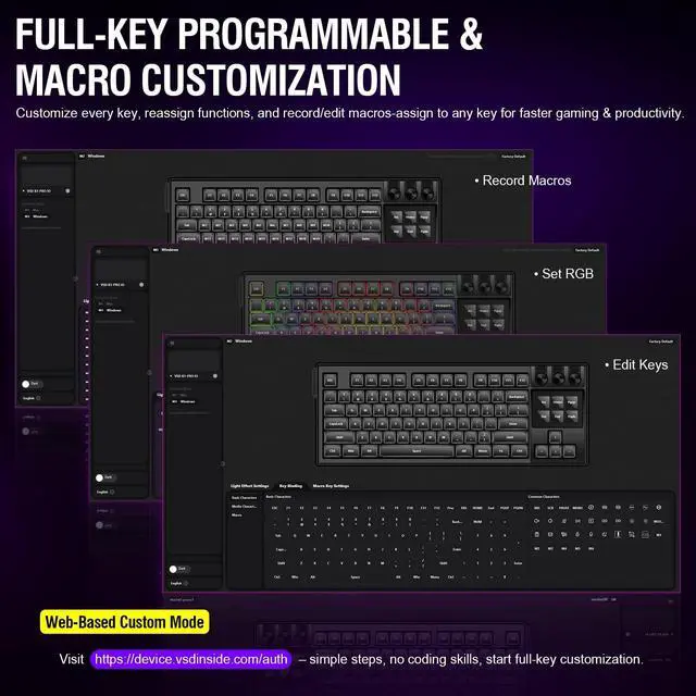 ^^ WEB-BASED CUSTOM MODE: Full-key programming & macro editing (no coding skills required! ) through our web portal - tweak every key to match your gaming or productive setup. ^^