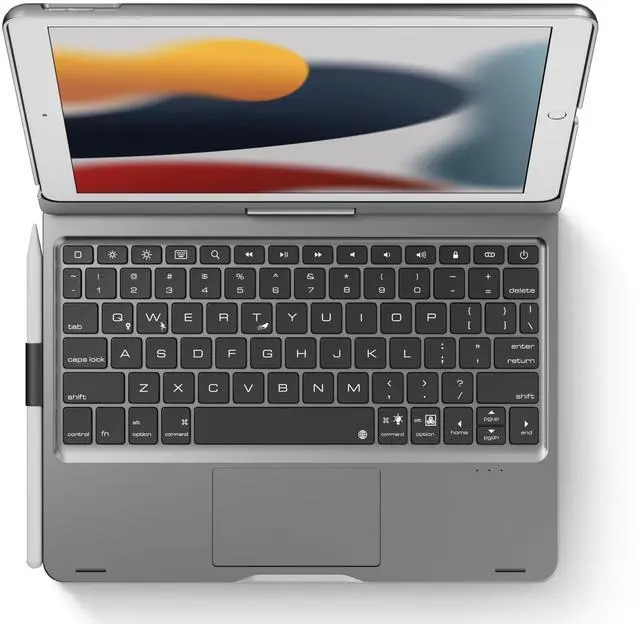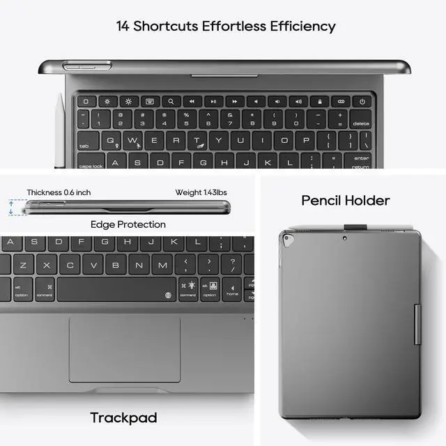 ^^: Equipped with ergonomic full-sized keyboard, providing comfortable and accurate typing experience. A Protective cover desgined with pencil holder that keeps your pencil secure and within easy reach.