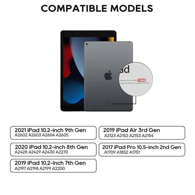 : Pekarejue swivel keyboard compatible with 2021 Apple iPad 9th Gen 10.2 -inch, 2020 Apple iPad 8th Gen 10.2 -inch, 2019 Apple iPad 7th Gen 10.2 -inch, 2019 Apple iPad Air 3rd Gen 10.5 -inch & 2017 Apple iPad Pro 2nd Gen 10.5 -inch. iPad Models Including A2602, A2604, A2603, A2605, A2428, A2429, A2430, A2270, A2197, A2198, A2199, A2200, A2154, A2123, A2153, A2152, A1709, A1852, A1701.