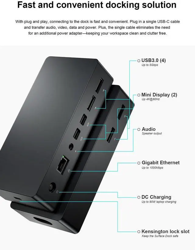 Surface dock With simple plug and play connectivity. The surface docking station uses surface connection, which has high-speed transmission of video, audio and data keep your desktop tidy. ^^ {What You Get} 1 Year Warranty with Replacement Coverage1*Surface Dock1* 90W Power Supply1* Power Cable 1 * instruction manual.
