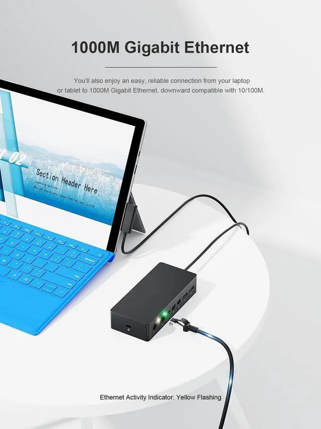 {High-Speed Data Transmission & Audio Output Port} Surface Dock is Ultra fast with speeds of 5Gbps for 4x USB 3.0 Ports, 3.5 Audio can be connected to audio equipment such as earphones and speakers. Surface Pro LAN Adapter offers full 1000Mbps over RJ45 Ethernet port. ^^ {Compatible List for Surface Device}The surface docking station compatible with Surface Pro 9/8/X/7/6/5/4/3/2017, Surface Laptop 5/4/3/2, Surface Laptop go, Surface Laptop, Surface Book3/2, Surface Book, and computer peripherals. Connect your peripherals to the Surface dock, and then connect the magnetic surface connection cable to your surface device.