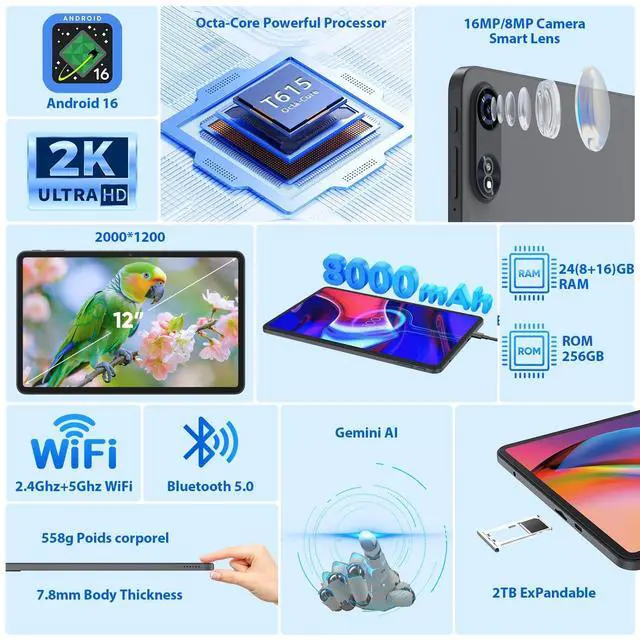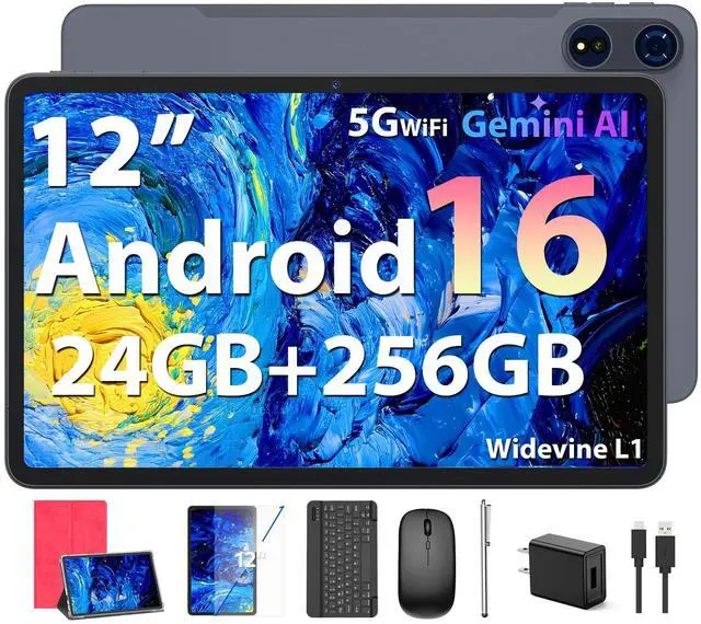2026 Newest Android 16 + Gemini AIThe JJGJ Android tablet with keyboard runs 2026 latest Android 16 OS, delivering an upgraded interactive system and enhanced data protection. Its user-friendly interface and seamless software-hardware integration provide an exceptional user experience. The 12-inch tablet supports Gemini AI, which is your smart and personal AI assistant ^^ 12" 2K Display + Dual SpeakersThis Android 16 tablet features a 12-inch 2K (12002000) eye protection screen, engineered to deliver immersive visual experience. Certified with Widevine L1, it supports 1080P HD content playback on major streaming platforms. Dual stereo speakers brings enhanced audio output ^^ 24(8 + 16)GB RAM + 256GB ROMEquipped with 24GB RAM (8GB physical + 16GB virtual expansion) and 256GB ROM, this tablet with keyboard effortlessly juggles work and entertainment store over 50, 000 photos, 300+ HD movies, or a full collection of e-books.