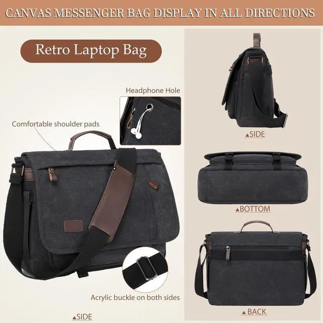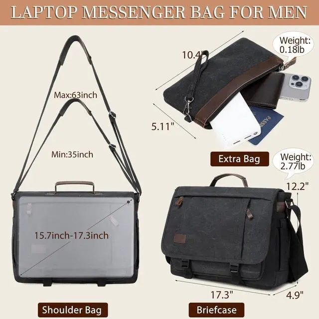 [ 2 PCS RETRO MEN'S MESSENGER BAG ] Office work bag for men is made of water repellent canvas with PU brown leather. Disordered wrinkles and scratches on surface create a vintage and wild looking. Comes with a small bag for pens, keys, mobile phone and cash, perfect for people in college, business and work. ^^ [ 17.3" LAPTOP BAG DIMENSIONS ] The external dimension of this briefcase is 17.3"L * 4.7"W * 10.2"H ( 2.77 pounds). Extra bag is 7.8"L * 4.8"H ( 0.18 pounds). This messenger bag inner padded laptop sleeve fits up to 12.9 inch- 17.3 inch laptop/tablet/computer.