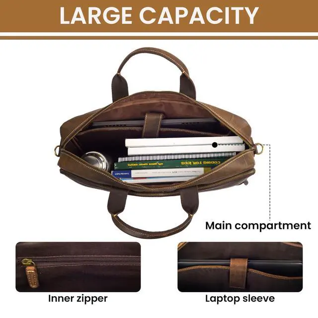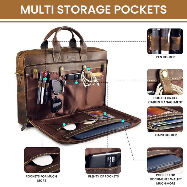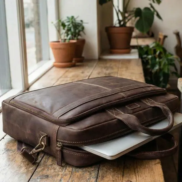 DescriptionThe Rasava Genuine Leather Laptop Messenger Bag is crafted from premium top-grain leather, offering durability and timeless appeal. Designed by skilled craftsmen, it features genuine YKK zippers and antique brass fittings for enhanced strength and style. This bag fits laptops up to 16 inches and includes multiple compartments to keep your essentials organized. It is ideal for professionals, students, and travelers who need a blend of function and sophistication. The adjustable and detachable shoulder strap ensures comfortable carrying throughout the day. A built-in trolley strap allows for easy attachment to your suitcase, making travel hassle-free.