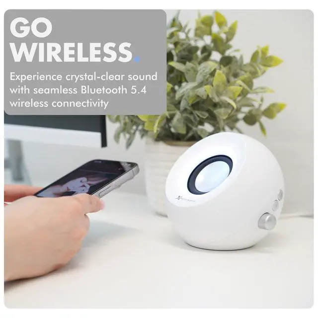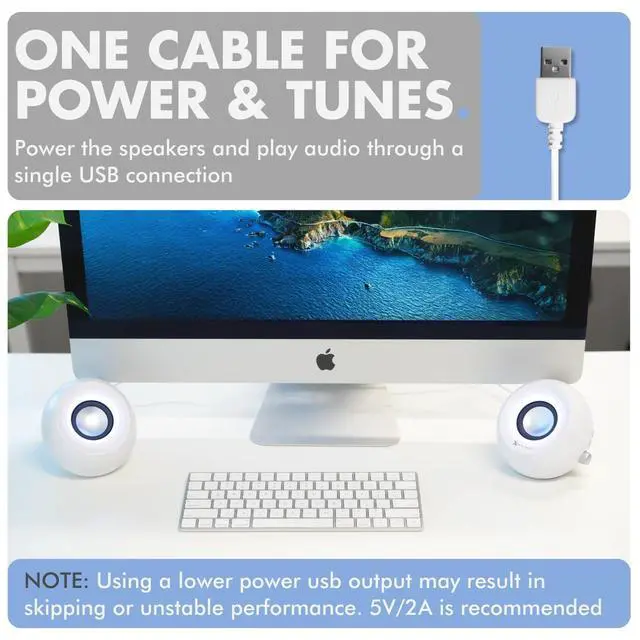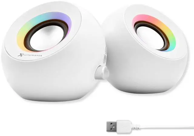 (3 WAYS TO CONNECT) Play your music with the speakers for laptop through Bluetooth, USB wired, or AUX in for maximum flexibility with any device. ^^ (CUSTOMIZABLE LED LIGHTING) Cycle through 10 vibrant LED color options on our white pc speakers or turn them off for a clean and calm workspace. ^^ (COLOR YOUR SPACE WITH SOUND) Our small computer speakers are equipped with dual 2.25 inch drivers with passive radiators that fill your space with rich, lively audio for every mood and moment. ^^ (SIMPLE CONTROLS AT YOUR FINGERTIPS) Quickly adjust volume, change LED colors, and switch between Bluetooth 5.4, USB, or AUX with simple button controls on our white speakers for pc.