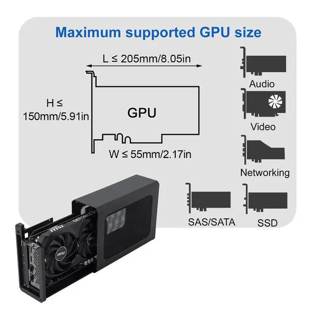 Compatibility: Compatible with most NVIDIA/AMD graphics cards up to 205mm ( 8.07 ) in length, 150mm ( 5.91 ) in height, and 55mm ( 2.17 ) in width. Support Windows 10/11, Linux ^^