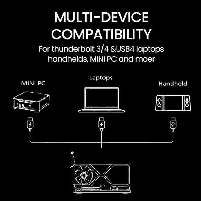 Application: Compatible with NUC/laptop/handheld game console with Thunderbolt 4/3 USB4 interface. Note that The Type-C port is not applicable if it does not support Thunderbolt 3/4 or USB4 protocols. And package does not contain the graphics card ^^