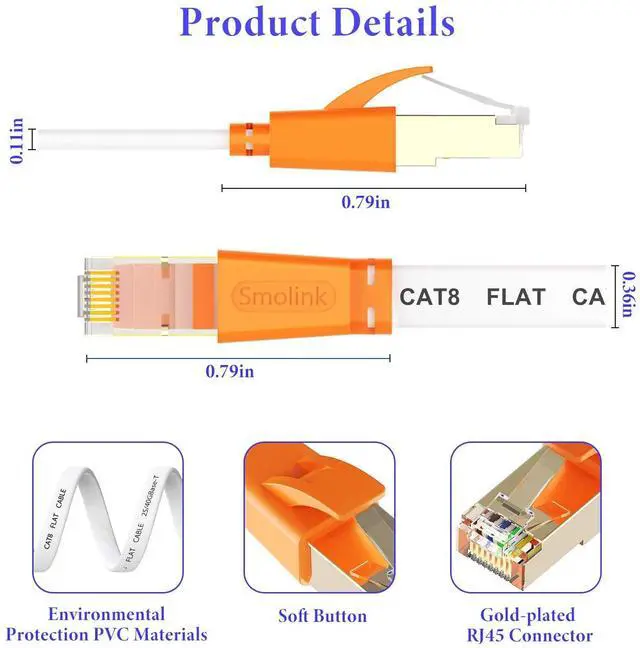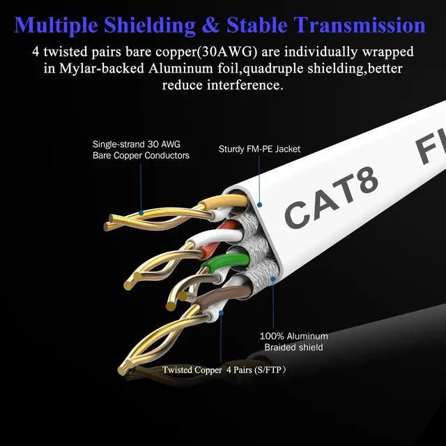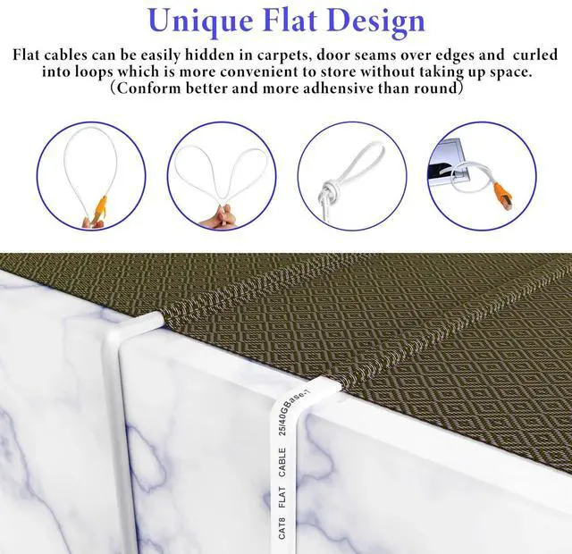 Space Saving: Cat 8 RJ45 cable adopts optimized flat shape design, easy to install, more flexible and perfectly fit the corner, it can be easily hidden in the carpet, door cracks and other places, more space saving. If you don't need the whole length, you can easily roll it into a loop, effectively avoiding tangles. Our Cat 8 network cable provides optimal EMI/RFI interference protection and long-distance data transmission to better protect signal quality ^^