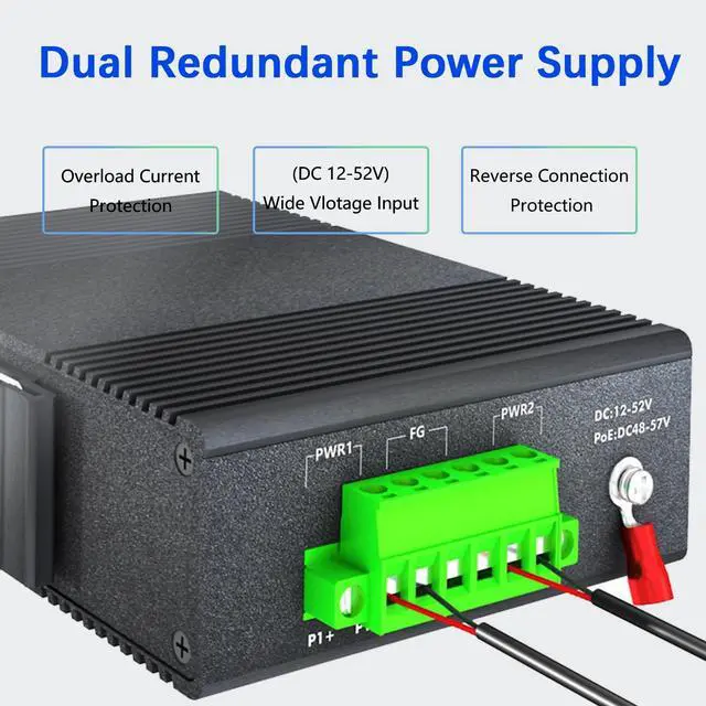 ^^ Redundant Power: Dual redundant power supply interfaces, automatic fault switching, anti-overload protection, working voltage 12-52V, will not damage the equipment.