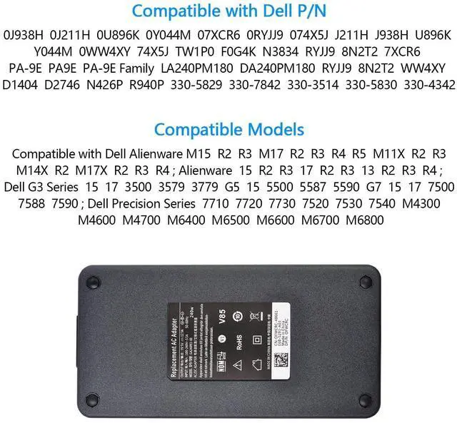 COMPATIBLE WITH DELL P/N: 0J938H, 0J211H, 0U896K, 0Y044M, 07XCR6, 0RYJJ9, 074X5J, J211H, J938H, U896K, Y044M, 0WW4XY, 74X5J, TW1P0, F0G4K, N3834, RYJJ9, 8N2T2, 7XCR6, PA-9E, PA9E, PA-9E Family, LA240PM180, DA240PM180, RYJJ9, 8N2T2, WW4XY, D1404, D2746, N426P, R940P, 330-5829, 330-7842, 330-3514, 330-5830, 330-4342.
