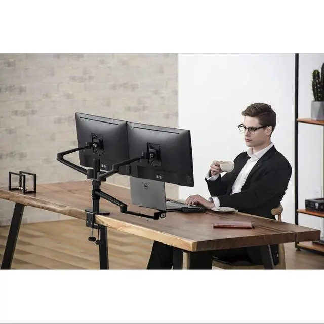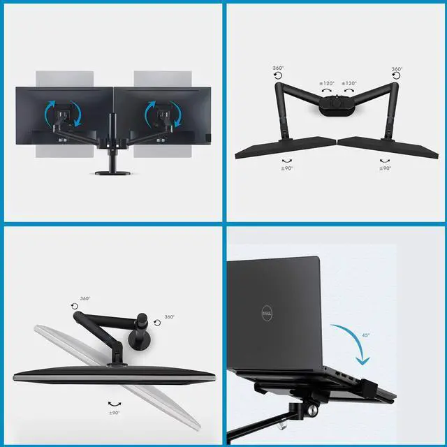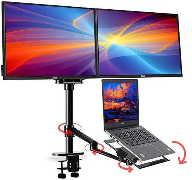 BETTER ERGONOMICS: --The screen can freely swivel 360 degree, and easily adjust the monitor and laptop to the most comfortable position, monitor mounting arm offers 145 degree tilt, the maximum extension length up to 52cm/ 20.5", reach the height of 56cm/ 21.8", Laptop mounting arm offers 60 degree tilt, the maximum height up to 56cm/ 21.8".