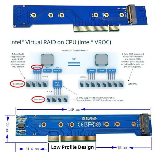 Low Profile design: The low profile type Allowing you to connect it to 1U PCI-E port, even if space around the port is limited. ^^ 2. Only supports motherboards with bifurcation detachable PCI-E channels. Control the operation of two disks based on the motherboard PCIE channel, The motherboard without PCIE signal split can only recognize one disk. NVME dual-disks design, Stable installation, Can run dual NVME disks at full speed at the same time. ^^ 3. Built-in multiple sets of high-power DC modules for sustainable and stable work. The innovative design can accommodate two NVMEs of the chassis, and can support simultaneous operation. ^^ 5. VROC is an enterprise RAID solution that unleashes the performance of NVMe SSDs, enabled by a feature in Scalable processors called Volume Management Device (VMD), an integrated controller inside the CPU PCIe root complex. VROC enables these benefits without the complexity, cost, and power consumption of traditional hardware RAID host bus adapter (HBA) cards placed between the drives and the CPU. ^^ 1. The product does not support hardware raid, the product only supports the formation of Vroc soft raid under win10/win11 system, or the use of other third-party software to build raid.