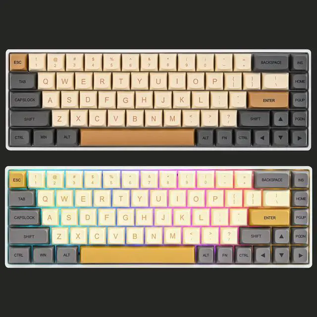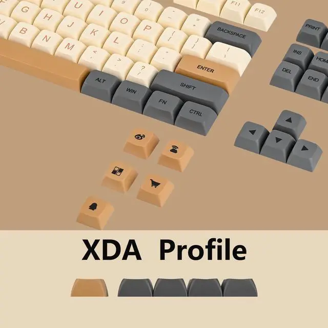 Glimmer Theme Style: The keycaps is glimmer keycaps. The design is made up of brown, beige, dark grey three colors, Minimalist and retro is the keycaps theme. ^^ Sublimation PBT KeycapsThe keyboard keycaps deliver in quality with ultra-durability dye-sublimated PBT plastic whose legends will never wear away. The Dye-Sub PBT keycaps enhance the overall durability with water and dust resistance. ^^ XDA ProfileThe XDA keycap has a larger surface contact which is lower than Cherry profile and OEM profile. It is not easy to fatigue after long-term use and has better comfort, bring you a lasting and comfortable typing experience. ^^ Wide CompatibilityThis keycap set can be used for most ANSI US layout mechanical keyboards and any key switch with mx switch. 125 keys can fit for 61/87/104/108/84/64/98/96 mechanical keyboard. ^^ What You Get1x 125 keys keycap set. Please notice that the keyboard in the picture is only for demo not included in the packaeg.