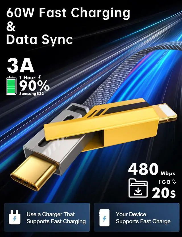 High-Speed Charging: Our multi-charging cable is equipped with 60W charging power, allowing you to get the power required for one day in 35 minutes.
