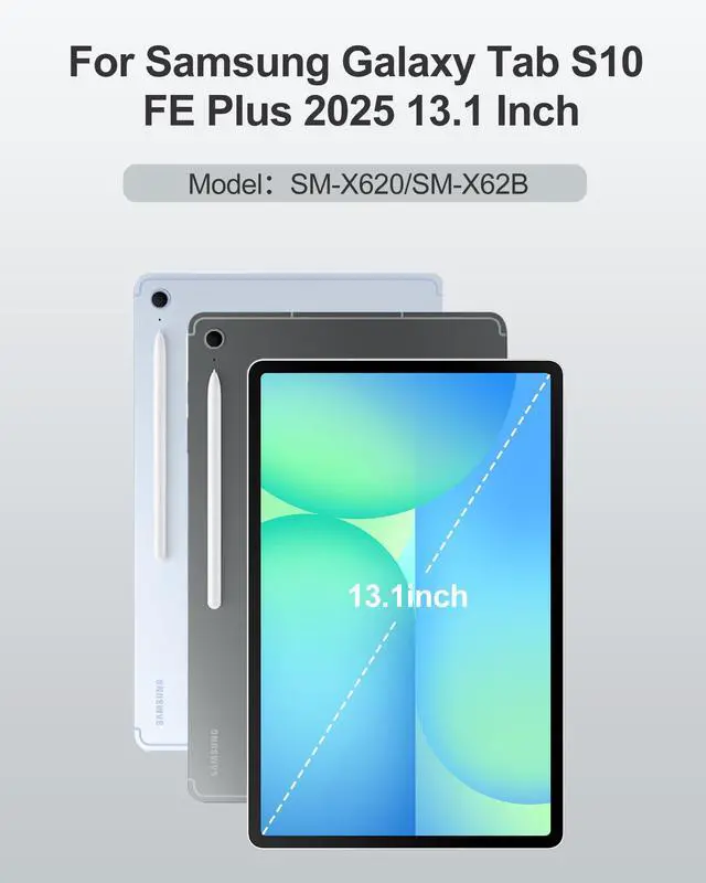 OYOSUOGG for Samsung Galaxy Tab S10 FE Plus + Keyboard Case - Magetic Keyboard for Samsung 13.1 Inch Tablet Protector Case - Wireless Detachable Keyboard & Soft PU Cover & Rechargeable Battery & S Pen Holder & Adjustable View Angles & Auto Wake/Sleep & Shortcut KeysExclusively designed for 2025 new Released galaxy tablet s10 fe + 13.1 inch (Model: SM-X620, SM-X626, SM-X626B). Not fit any other models. Please check back bottom of your tablet to confirm the model number. Easy of Use / Galaxy 13.1 inch Tab KeyboardTransform your tablet into a powerful productivity tool with our tablet keyboard case for samsung galaxy. This teclado galaxy tab 2025 s10fe+ offers a seamless typing experience. Keyboard FunctionallyMagnetically detachable super slim 5mm and light weight bluetooth keyboard with 10M range. And the book cover keyboard tab s10 fe + with strong magnetic keyboard gives you a stable platform for typing that won't move easily. Stylus Pen HolderThis keypad for galaxy case is designed with pen holder, grab your pencil effortlessly whenever you want, easily to carry your pencil with your device. Rechargeable BatteryBuilt-in rechargeable battery for long keyboard life. For samsung tablet s10fe+ case keyboard ensures your device is always ready for action. Precise CutoutsPrecise cutout allows full access to all ports, user interface, sensors, speakers, microphone and cameras. Multiple Viewing AnglesThis magnetic keyboard 13.1 inch case for samsung tablet has 3 grooves to adjust the viewing angle as you like, make your tablet stand steadily.