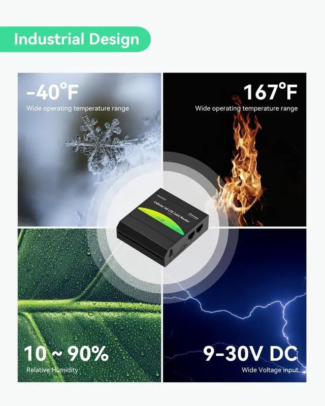 INDUSTRIAL 4G LTE ROUTER - Features with a built-in LTE CAT4 modem(150 Mbps download/ 50 Mbps uplink). It also equipped with 2*10/100 Mbps Ethernet ports. Wi-Fi compliance with 802.11 b/g/n standard, Access Point (AP), Station (STA). ^^ CERTIFIED BY VERIZON/AT&T/T-MOBILE - 3G/4G LTE CAT4 wireless connection, Compatible with major carriers and Certified by Verizon/AT&T/T-Mobile. ^^ AUTOMATIC FAILOVER-Ensure highly reliable connectivity by automatic failover among local LAN, cellular and WiFi networks, with configurable priority. ^^ INDUSTRIAL DESIGN -Aluminium housing; Wide voltage input 9-30V DC and wide operating temperature range -40F ~ 167F (-40C ~ 75C), suitable for harsh environments.