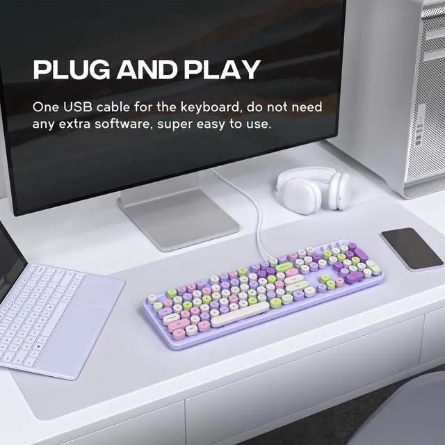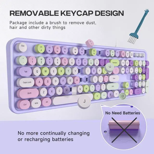 Retro Typewriter KeyboardCute round keycaps, crisp and sweet sound, perfect knocking feel, let you find the feeling of a retro typewriter. And its detachable, making the keyboard easy to clean. ^^ Plug and PlayOne USB cable for the keyboard without installing any additional software. Just need insert it to the USB port of your device. Super easy to use! ^^ Upgrading TechnologyThe keycaps are made of ABS environment-friendly plastic characterized by ergonomic design and comfortable feel. ^^ Wide CompatibilitySuit for Windows 7, 8, 10, XP/Vista, MAC OS, iOS.