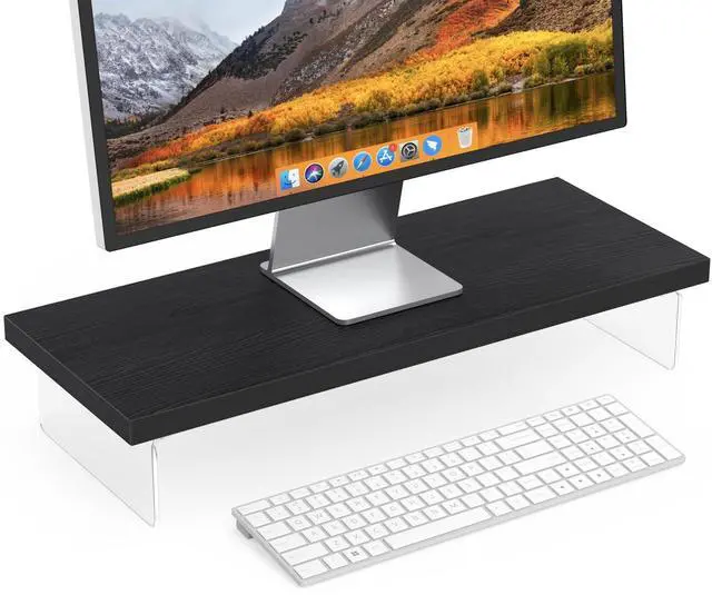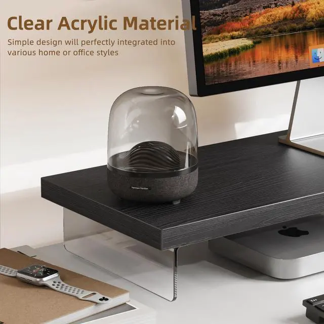 [Elegant Aesthetic Design] SSWOOD Desktop Organizer Stand combines natural wood grain with crystal-clear acrylic for 360 visible elegance, offering a modern and artistic touch to any workspace. The widened lower layer provides extra storage for keyboards, mice, and office supplies, enhancing both functionality and style. ^^ [Premium Durability] Computer monitor stand riser constructed with high-quality 1-inch solid wood and reinforced wood-acrylic hybrid structure, the stand supports up to 50kg/110lbs, making it 11% stronger than steel-embedded acrylic stands (45kg) and 42% sturdier than crystal-brick designs (35kg). Cross-jointed wood beams prevent warping, ensuring long-lasting stability.