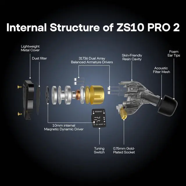 This powerful combination redefines audio excellence, surpassing even the highest HiFi standards, and meets the precise demands of professional musicians and audiophiles. The custom-engineered 31736 balanced armature drivers excel in delivering high-frequency and ultra-high-frequency sounds, capturing every nuanced detail. ^^ -, - To accommodate a variety of sound preferences, the ZS10 Pro 2 features a 4-level custom tuning switch, expertly designed for detailed personalization. Whether you desire crystal-clear vocals, deep, resonant bass, or full, rich chords, this switch allows effortless adjustments to suit your audio tastes.