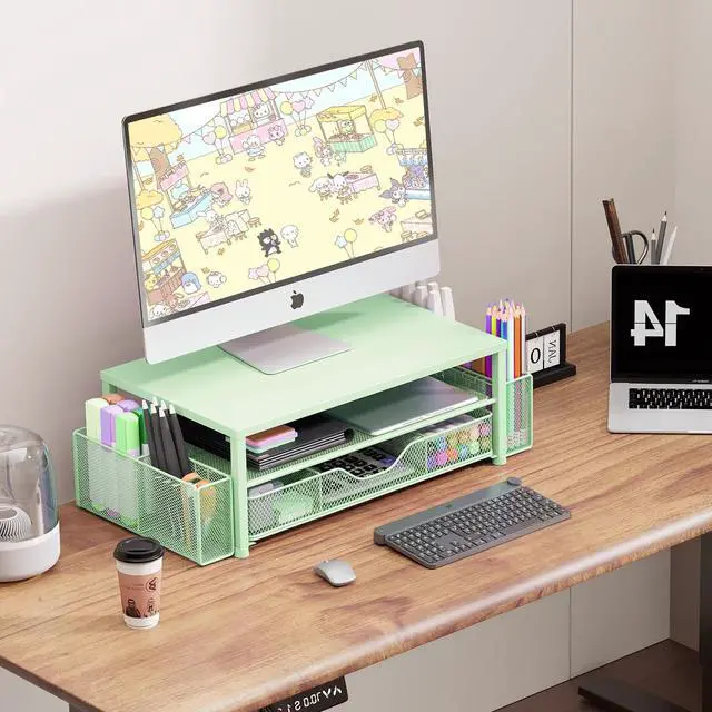 Ergonomic DesignOPNICE newly releases the monitor stand for desk organizer! This computer stand elevates your monitor or laptop to a comfortable viewing height, relieving pressure on your neck, shoulders. Ideal for strengthening office organization and increasing comfort levels ^^ Save SpaceThis 2-Tier monitor stand with drawer and 2 hanging pen holders provides ample storage space to keep your office supplies and office desk accessories neatly organized and easily accessible, keeping your workspace tidy and improving your sense of well-being ^^ Durable and StableThe metal computer stand is made of high quality material with sturdy construction, it can easily carry the weight of the display and computer accessories, to ensure stable and non-shaking for a long time, ideal for use in the office, dorm room or home ^^ Sleek and AestheticThis desktop organizer features a modern minimalist design that blends seamlessly with any office decor.