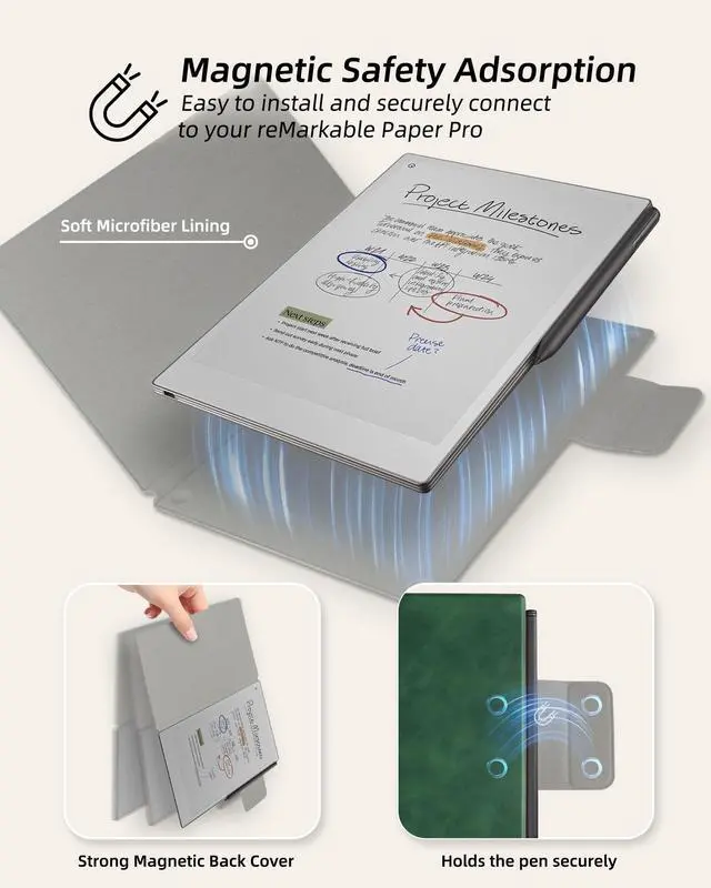[Perfect Fit] Exclusively designed for the 11.8" reMarkable Paper Pro 2024 Released. Not compatible with reMarkable 1/2 or other devices. Please confirm your device model before purchasing. (Stylus NOT included) ^^ [Strong Magnetic] Built-in strong magnets ensure a secure connection to your reMarkable Paper Pro, making it easy to install and providing a reliable hold to prevent device drop. ^^ [Premium Material] The reMarkable Paper Pro Tablet Case is crafted from premium PU leather with a soft microfiber lining. This design protects your device from scratches, dust, and bumps. ^^ [Slim and Lightweight] Engineered to be slim and lightweight, this reMarkable Paper Pro case adds minimal bulk to your reMarkable Paper Pro.