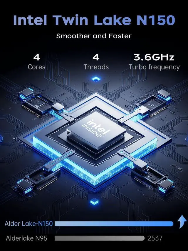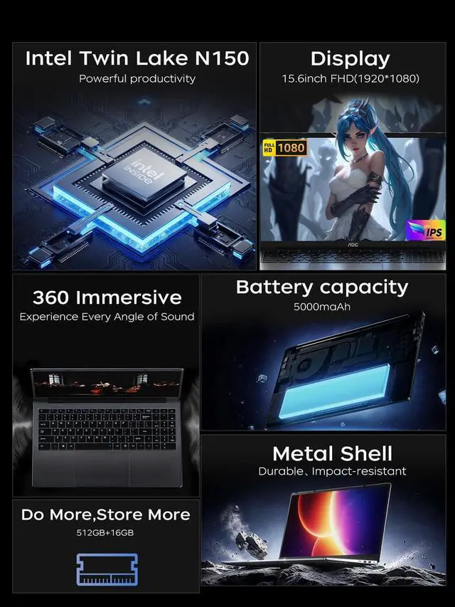 Higher Performance The laptop uses the latest 12th generation N150 processor (4C/4T, 6MB cache, 6W, up to 3.6GH z), which is much higher than Celeron N5095 or N95, providing more powerful multitasking capabilities. ^^ Large Amount of Storage & MemoryWith 16GB DDR4 memory and a 512GB M. 2 SSD (expandable up to 2TB), this laptop can effectively support your daily office work, various applications, web browsing, video viewing and efficient data processing. ^^ Full HD IPS Display - The laptop features an innovative 15.6" (1920 x 1080) high-definition IPS display with a 16:9 aspect ratio and Intel UHD graphics, ensuring you can enjoy superior color accuracy for a more immersive HD experience.