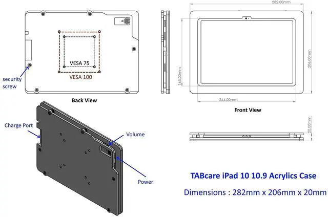 TABcare Anti-Theft Acrylic 75x75 VESA Enclosure for Apple iPad A16 10.9" 11" Tablet