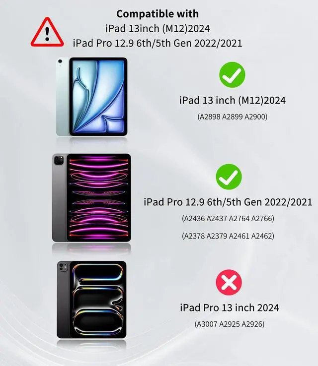 Wide Compatibility: This ipad keyboard case is designed to be compatible with the latest iPad models, for iPad Air 13-inch (M3/M2, 2025/2024) and the 12.9 -inch iPad Pro 5th and 6th Generation (2021/2022). Please verify your iPad model (A3269/A3271/A2900/A2899/A2898/A2437/A2764/A2766/A2378/A2379/A2461/A2462) before purchasing to ensure a perfect fit ^^