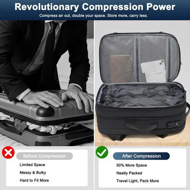 . Skip baggage fees, skip long check-in linesjust zip, compress, and board with everything you need. ^^ Smart Multi-Compartment Organization Always Stay Neat This vacuum seal backpack is designed for modern travelers with 3 large compartments, a padded laptop sleeve (fits up to 17.3" ), a waterproof wet/dry pocket for shoes or gym gear, and multiple organizer pockets. Perfect as a work backpack, gym backpack, or versatile travel daypack that adapts to every journey. ^^ TSA Lock & Hidden Pocket Security You Can Trust Travel with confidence. The built-in TSA-approved lock and discreet anti-theft pocket keep passports, cards, and valuables safewhether youre at airports, subways, or busy city streets.