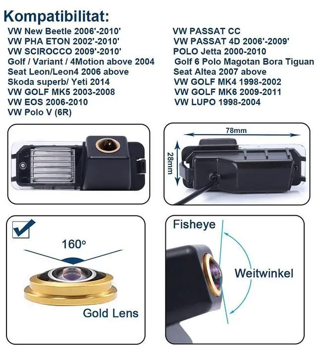 Dear customer, Please must check the camera size and appearance before place a order, see if can fit your car license plate lamp place size and appearance! Because the same car model in different countries may have some difference, please check the camera size and compare the installation of your car carefully to avoid mistake. This product could fit for all below models as expected: Replacement for VW New Beetle 2006, -2010; PHAETON 2002, -2010; SCIROCCO 2009, -2010; Golf/ Variant / 4Motion above 2004; Seat Leon/Leon4 2006 above; Skoda superb / Yeti 2014; GOLF MK5 2003-2008; EOS 2006-2010; Polo V (6R); PASSAT CC; PASSAT 4D 2006, -2009; POLO Jetta 2000-2010; Golf6 Polo Magotan TiguanSeat Altea 2007 above; GOLF MK4 1998-2002; GOLF MK6 2009-2011; LUPO 1998-2004 -