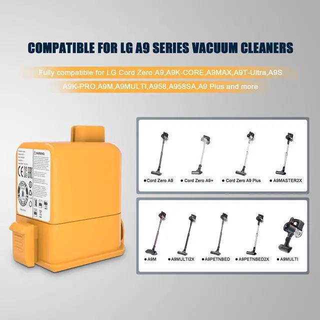 Specification] Voltage: 25.55V, Capacity: 2800mAh, Watt: 71.5W h, Battery TypeEAC63758601 EAC63382201 EAC63382202 EAC63382204 EAC63382208 EAC63382205. ^^ [Battery Compatibility] Compatible for LG Cord Zero A9M, A9N, A9S, P9, A9MASTER2X, A9MULTI, A958, A958SK A958S A958SA A958VA, A9MULTI2X, A9S, A9PETNBED2X, A9 PLUS A905M A907GMS A905RM A908MVR A927KGMS A929KVM A9K MAX A916. A9T-S Kompressor. ^^ [Safety Made] multiple safety protection, high capacity, light weight, high quality battery. No memory effect, overcharge, overdischarge, overheat, overcurrent and short circuit protection. The perfect replacement for your original battery. ^^ [High Capacity] 2800mAh high capacity, 45 minutes uninterrupted operation working time, rechargeable battery provides extended runtime for your LG cordless vacuum cleaners. ^^ [What Your Get] One pack 2800mAh battery for LG Cord Zero series, 24*7hour customer service, 12 months warranty, any problems please feel free to contact us anytime.