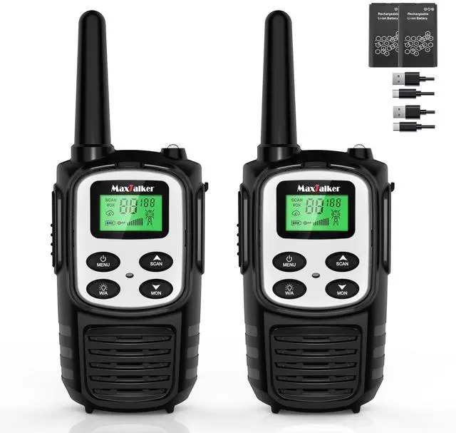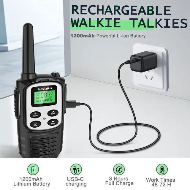 MaxTalker Rechargeable Walkie Talkies: The MT10 Walkie Talkies features a powerful 1200mAh rechargeable lithium battery, replacing the previous AAA battery design. This upgrade allows for longer usage times and significantly improves convenience with outstanding standby time of up to 72 hours. You can enjoy extended communication without the hassle of replacing disposable batteries frequently ^^
