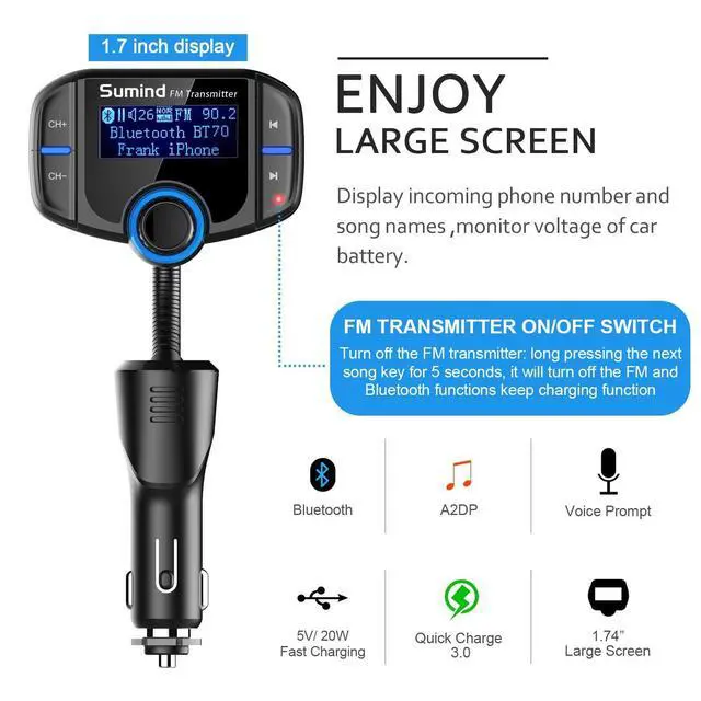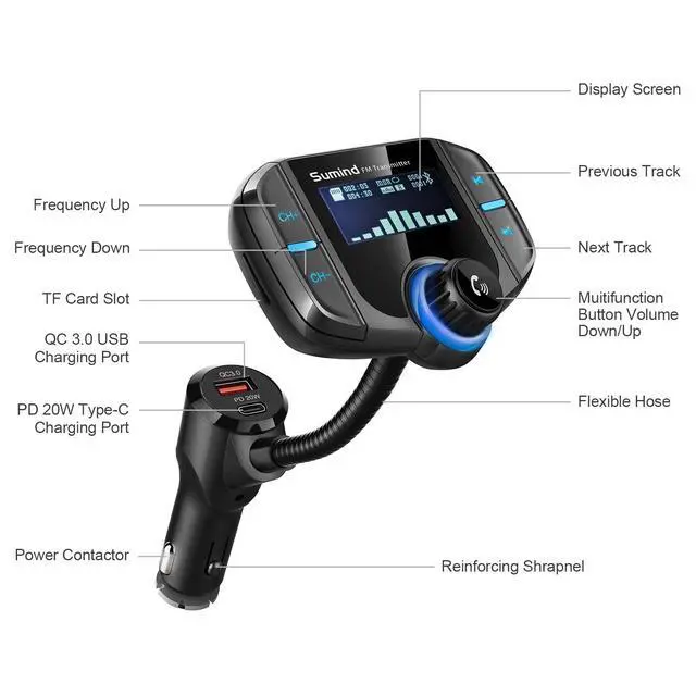 Sumind 2026 Upgraded Wireless Bluetooth Car Adapter FM Transmitter, 1.7'' LCD Display, Flexible Gooseneck, 20W QC3.0&Dual USB Ports, AUX Input/Output for Hands-Free Call, Micro/TF Card(Black,PD)