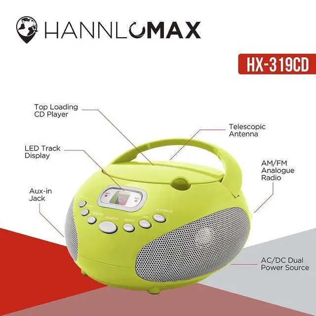 HANNLOMAX HX-319CD Portable CD Boombox, AM/FM Radio, LED Display, Aux-in Jack, AC/DC Dual Power Source. (Green)