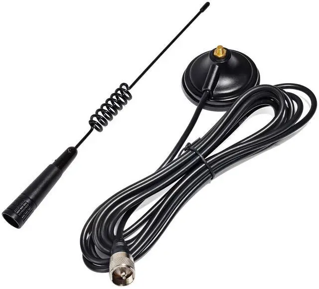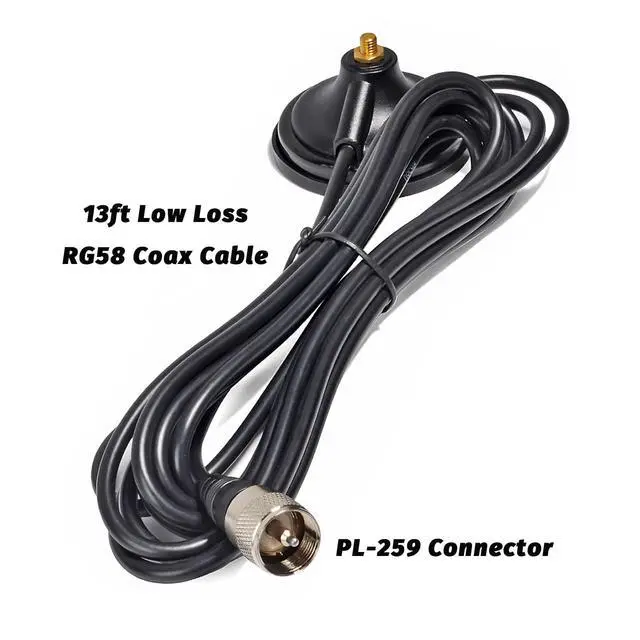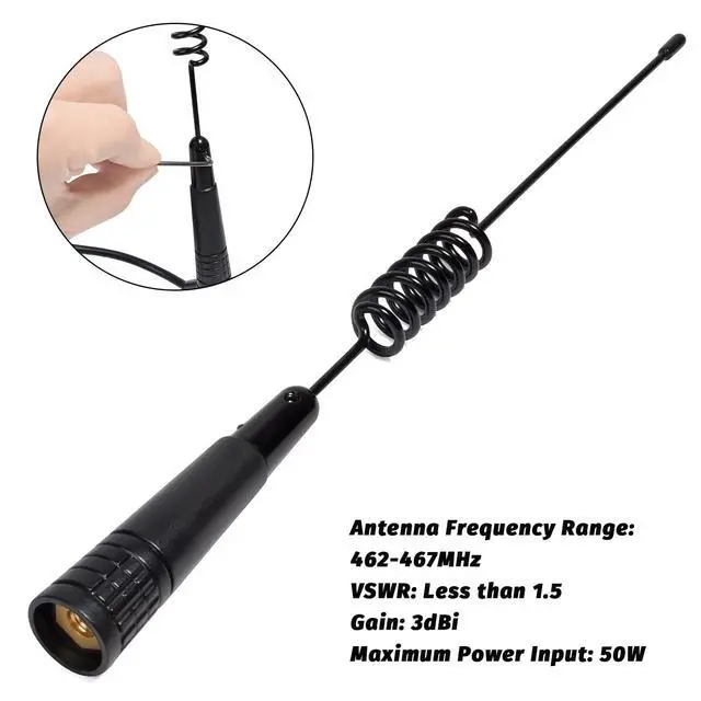 This GMRS radio antenna features UHF of 462-467MHz with VSWR less than or equal 1.5 ^^ The GMRS antenna features great specifications with vertical polarization and 3.0 dBi gain for better TX and RX. The maximum power input is 50W along with impedance ranging 50 ^^ This 13inches/34cm tall antenna is composed of antenna body, magnet mount and coax cable. High quality materials make it lightweight and durable ^^ 2.7" magnet mount and 13ft RG58 coax cable (end with PL259 connector) for mobile use of GMRS radios ^^ This magnet mount antenna is ideal for use with 462-467MHz GMRS radios.