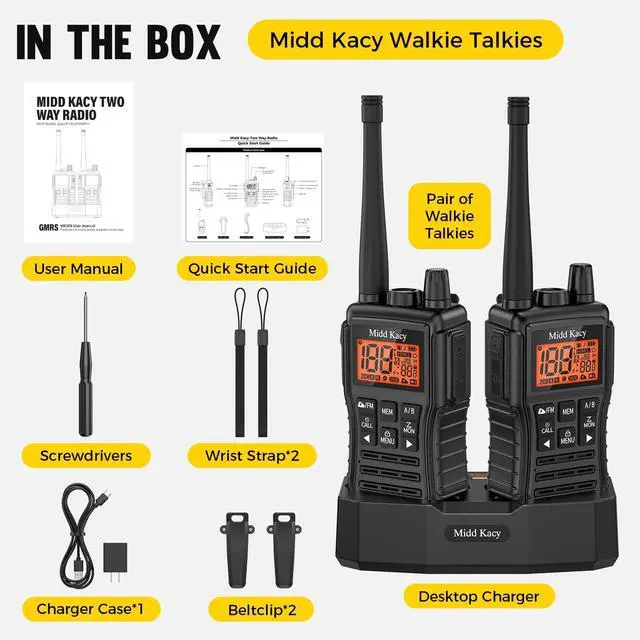 ^^ New Flashlight & Memory ModeThe integrated LED flashlight adds extra convenience, and the striking orange backlit LCD screen makes the MK208 portable two way radio visible at night, making it ideal for activities such as hiking or camping. Memory mode stores 10 frequently used channel/safety code combinations for quick recall of the current channel. ^^ Unique Multi-functional DesignIP55 waterproof, SOS, VOX (hands-free), FM, Push To Talk (PTT) buttons; 10 call tone settings; silent operation mode; keypad lock and many other features add a lot of fun operability to the MK208 gmrs radio.