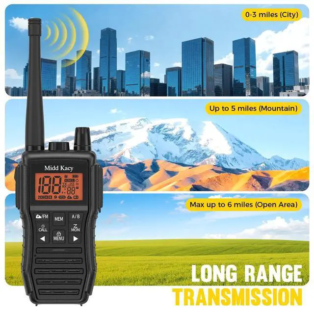 User-Friendly DesignFeaturing an ergonomic grip for comfortable handling, this MK208 walkie talkies long range provides quick access to 61 channels and 121 privacy codes with simple button control. Enjoy seamless cross-brand communication (channels 1-22) and clear, interference-free calls with reversible scanning and privacy code filtering. ^^ 6 Miles of Actual Long Communication RangeThe MK208 gmrs handheld radio delivers long-range communication up to 6 miles in open areas (rural, suburban, coastal) and 3-5 miles in urban environments, with adjustable high/medium/low power settings. This long range walkie talkies is perfect for reliable long-distance communication in any terrain.