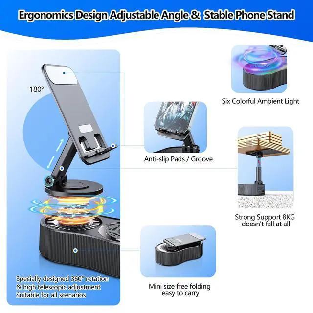 The triple anti-slip protection system-reinforced base, textured backplate, and silicone-grooved cradle-guarantees secure placement of smartphones (4-13"), tablets, and e-readers, even during intense usage ^^ Six Colorful Ambient LightThe portable pa system is equipped with six color modes of colorful lights that can switch between different colors of lighting. The LED light show along the phone holder is bright and vibrant, lighting modes just add to the whole effect and beauty of this product in a super cool way. Playing in multiple different patterns as almost a soothing mode for watching movies or listening to something ^^ Gifts for Men WomenPortable speaker, is perfect for bedroom, office, camping, hiking, yoga, cooking and more, this cell phone stand has universal compatibility and can stably support most 4-13 smartphones, tablets and e-readers.