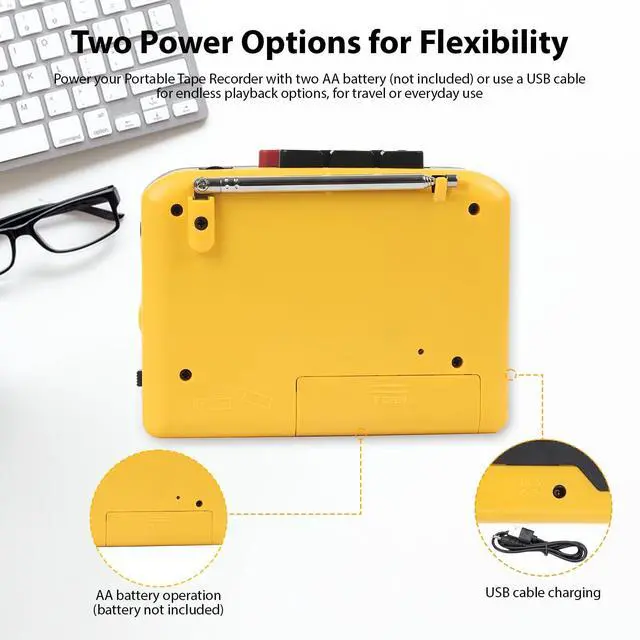 [Multiple Playback Options] This portable cassette player is compact and can fit into almost any bag. cassette player power with 2 aa batteries or use a usb cable for endless playback options, ideal for travel or everyday use. ^^ [Convenient Function Switch] This cassette player easily switch between am and fm stations using the simple function selector and tuning knob for your favorite shows and music. enabling you to listen to your favorite radio stations anytime, anywhere. ^^ [Listening Experience] This portable cassette player connect your headphones via the 3.5 mm earphone jack for a more immersive listening experience without disturbing others.