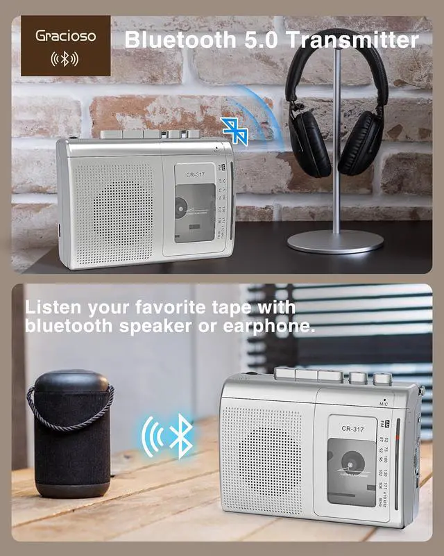Powerful retro tape playerThis tape player is designed with a retro body, with a classic attractive silver appearance, not only can play tapes, but also listen to AM/FM, recording and Bluetooth four types of playback, is a lightweight and portable tape player. You can also connect the Bluetooth speaker to listen to old tapes. Whether it is classic tapes, popular digital music, or radio news, you will never miss again, this cassette player is suitable for everyone in the family. ^^ Built-in Bluetooth Transmitter & Cassette RecorderThis portable cassette player has Bluetooth 5.0 transmitter and built-in high-quality speakers, so you can connect your Bluetooth headphone or Bluetooth speaker to listen to your cassette music.
