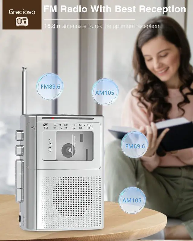 (Not support to connect car bluetooth). Besides, this tape player has a recording function. You can put in a blank tape and record your voice or favorite music through the built-in microphone on the go. It is also a special recording gift for friends and relatives. ^^ Powerful AM/FM ReceptionThis cassette player is equipped with a long antenna and upgraded DSP chip, powerful signal reception to listening to clear radio stations, Best