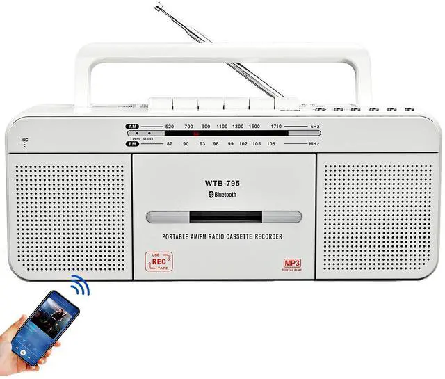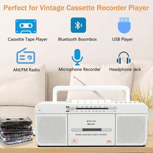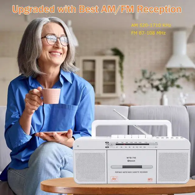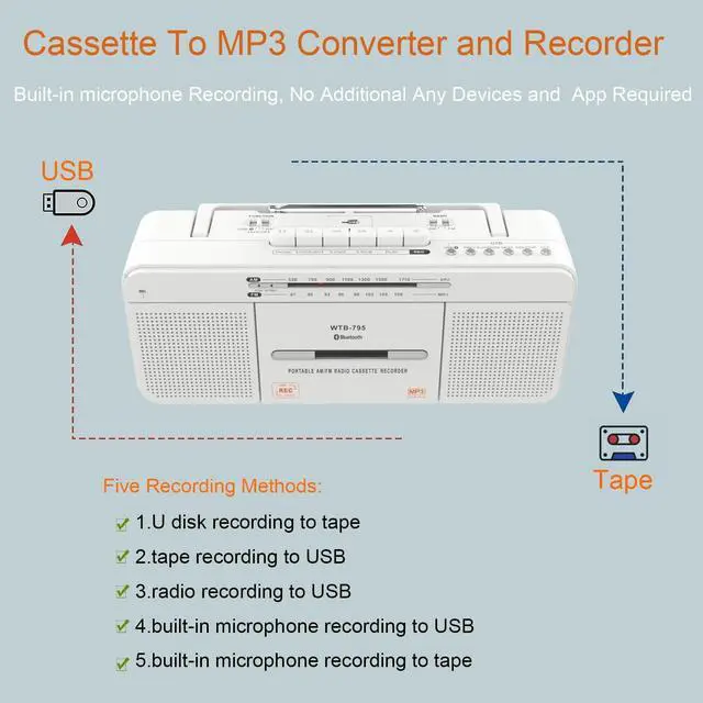 tips: The USB recording function only supports USB flash drives in FAT32 format. It does not support the default FAT (FAT16), exFAT, or NTFS formats. ^^ Portable Bluetooth Cassette Boombox and AC/Battery OperatedPlay music wirelessly from bluetooth devices, Note: No bluetooth transmitter function. Portable handle perfect for enjoying your favorite music and radio with this portable cassette player at home, in the shop, or while on the gowith power supply 1 x AC power cord (AC-120V-60Hz power uppower cord included) or insert 4 C Batteries (not included). ^^ Upgraded with Best AM/FM ReceptionThe extended antenna and upgraded DSP chip have excellent receiving capabilities, making listening to FM/AM radio stations worry-free. AM 520-1710 KHz, FM 87-108 MHz. ^^ Dual High-quality speakers and Headphone jackThe retro cassette player builds 2*3W high-quality large speakers make the sound louder and more thorough. The 3.5 mm headphone jack output also allows you to have a personal listening space. ^^ Fine Craftsmanship & Retro FashionMade of high-quality materials to ensure the durability and reliability of the product. The compact and lightweight body design makes it easy to carry. Whether it is a nostalgic time at home or an outdoor travel companion, it can perfectly integrate into your life and show a unique retro style. ^^ Tape Stereo Playback The WISCENT WTB-795 tape drive head has been rigorously screened and strictly controlled throughout the production process, striving to minimize the gap between the left and right channels.