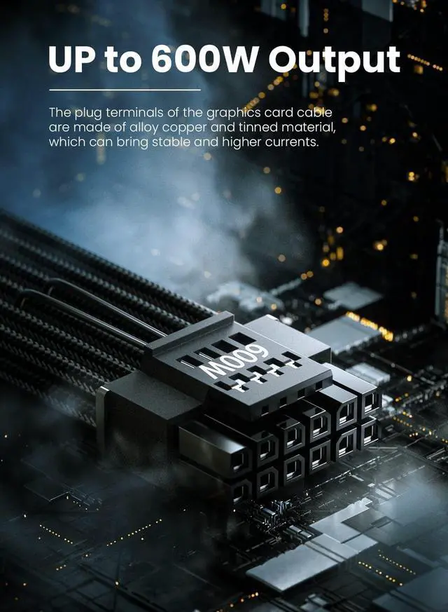 Note: This GPU sleeved extender cable is not fitted for 12pin GeForce RTX 3090 Series & 8pin RTX 4070 GPU. Only support 12+4pin GPU like RTX 3090Ti, RTX 40 and 50 Series ^^ Up to 600W OutputFasgear 12V-2x6 PSU extension cable supports up to 600W output. The plug terminals of the graphics card cable are made of alloy copper and tinned material, which can bring stable and higher currents.