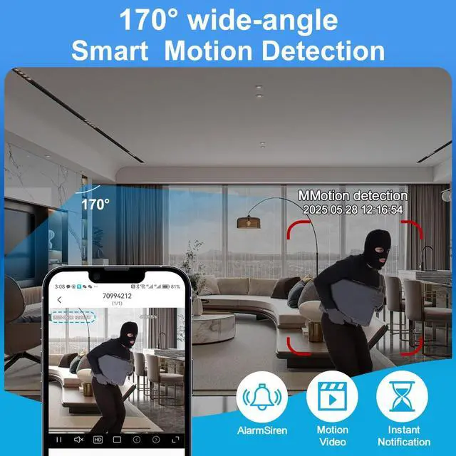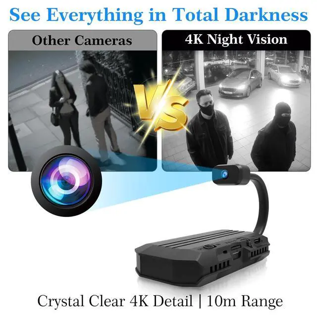 ^^ 4K Ultra HD Resolution with 8-Meter Night Vision Real-time monitoring delivers crystal-clear 4K resolution. Equipped with night vision capabilities, the camera captures sharp images even in complete darkness, providing round-the-clock protection for your home and property. ^^ 170 Ultra-Wide Angle, Loop RecordingThis mini camera is designed for monitoring areas without WiFi, such as cars, garages, cabins, campsites, motels, and similar locations. Featuring a built-in SD card slot supporting up to 128GB storage capacity, the camera automatically records and overwrites old footage without manual deletion. Alternatively, you can opt for secure encrypted cloud storage services.